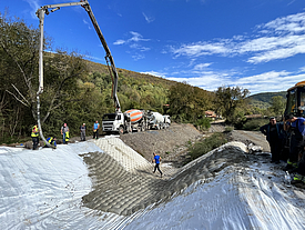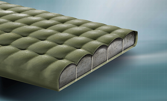 Die geosynthetischen Betonmatten bestehen aus zwei hochfesten Gewebelagen, die vor Ort mit fließfähigem Beton verfüllt werden. So entsteht eine stabile, anpassungsfähige Schutzschicht, die sich ideal an komplexe Geländeformen anschmiegt – sowohl über als auch unter Wasser.