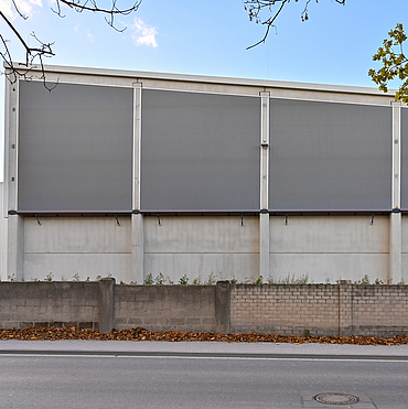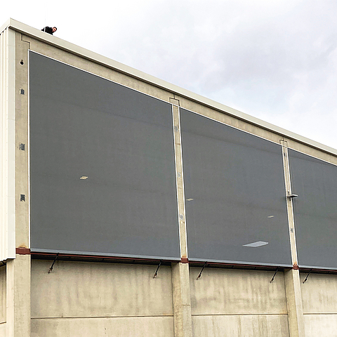Um eine Kombination aus flexiblem Wetterschutz und permanenter Belüftung zu realisieren, entschied sich die Noris Entsorgung GmbH für textile Torsysteme und Fassaden der Produktlinie Tectura. Installiert wurden zwei Faltfronten mit jeweils 14 m Breite und 9 m Höhe. Diese sind explizit für große Öffnungen bei hohen Windlasten ausgelegt und lassen sich von unten nach oben auffalten – ideal für häufiges Öffnen und Schließen im Umschlagsbetrieb. Ausgeführt wurden die Fronten mit einem Windschutznetz Typ 60/60-1. Das stark windbrechende Gewebe mit einer Windbremsung von bis zu 94 Prozent besteht aus einem PES-Gittergewebe mit einer PVC-Beschichtung, hat eine Maschenweite unter 1 mm × 1 mm und ein Materialgewicht von etwa 450 g/m². Zusätzlich kamen Tectura Spannvarianten mit den Maßen ca. 7 m × 7 m als Trapezgiebel zum Einsatz – ebenfalls bestehend aus dem Windschutznetz Typ 60/60-1. Die textile Fassade bietet Wind- und Wetterschutz bei gleichzeitiger Frischluftzufuhr und wurde für die exakte Trapezgiebel-Form maßgefertigt. Zur Reduktion der Geräuschimmissionen in Innen- und Außenbereichen wurde im Halleninneren außerdem eine ca. 150 m² große Schallschutzplane eingebaut.