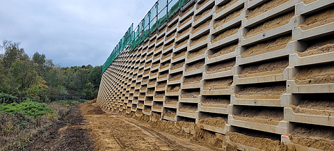 Darüber hinaus führte die schlanke, flexible Bauweise zu einer verkürzten Bauzeit und eröffnete erhebliche Einsparpotenziale bei den Gründungsarbeiten, da bei der gewählten Konstruktion auf ein über die gesamte Aufstandsfläche der Böschungssicherung ausgebildetes Betonfundament verzichtet werden konnte. Insgesamt erweist sich die alternative Bauweise damit als deutlich ressourcenschonender und nachhaltiger als eine Raumgitterwand.