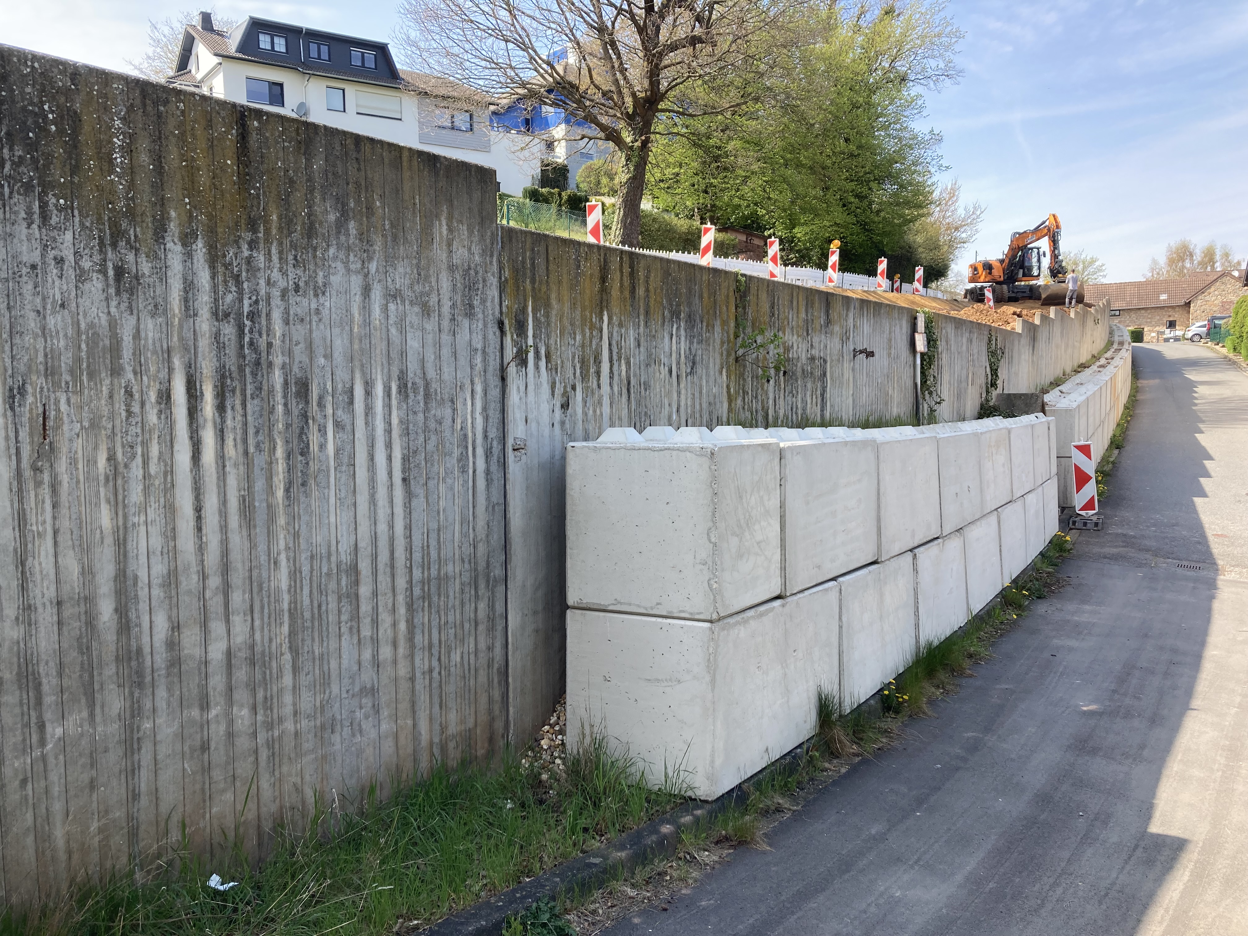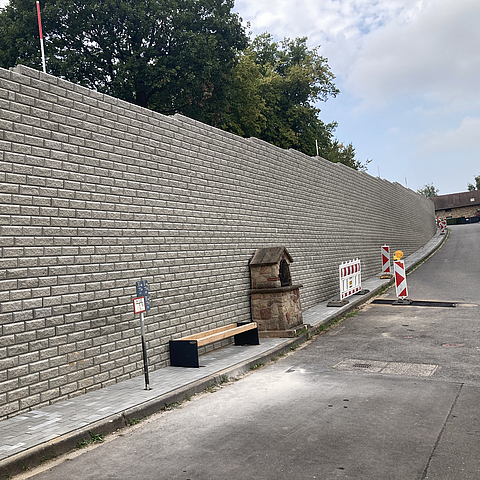 Durch die enge Abstimmung aller Projektbeteiligten ließ sich der Neubau erfolgreich und sicher umsetzen. Die neue Stützwand gewährleistet dauerhaft die Standsicherheit der oberhalb verlaufenden K32 und ersetzt die provisorischen Sicherungsmaßnahmen vollständig. Gegenüber einer massiven Betonwand bietet die KBE-Konstruktion deutliche Vorteile: geringerer Materialeinsatz, reduzierte Transportmengen und eine flexiblere Bauweise. Gleichzeitig fügt sich die Blocksteinansicht harmonisch in das Ortsbild ein. Die Lösung vereint damit technische Sicherheit, Wirtschaftlichkeit und ökologische Aspekte in einer langlebigen Bauwerksausführung.
