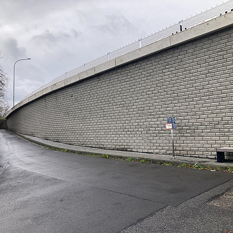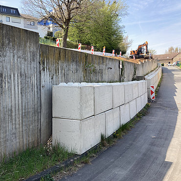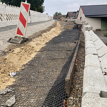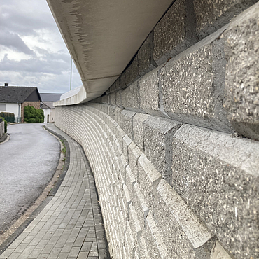 Der Kreis Düren plante gemeinsam mit dem Ingenieurbüro Dr. Jochims & Burtscheidt eine Stützwand in KBE-Bauweise (Kunstoffbewehrte Erde) mit passiver Ansichtsfläche aus gebrochenen Betonsteinen. Diese ist statisch mit dem bewehrten Erdkörper verbunden, übernimmt jedoch keine tragende Funktion. Nach erfolgreicher Ausschreibung beauftragte die Martin Wurzel Baugesellschaft mbH die HUESKER Synthetic GmbH mit der entsprechenden Ausführungsplanung sowie der Lieferung der dazugehörigen Systemkomponenten, bestehend aus Fortrac-Geogittern und INORA-Betonsteinen. Die Umsetzung erfolgte als Fortrac Block-System, bei dem der geokunststoffbewehrte Erdkörper die Lastabtragung übernimmt und die Blocksteinfront als dauerhafte, robuste Sichtfläche dient.
