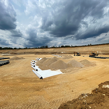 Zunächst erfolgte in Teilbereichen eine umfangreiche Rüttelstopfverdichtung zur Verbesserung des Baugrunds. Zur Erdfallsicherung und Lastverteilung kamen darüber hinaus rund 232.600 m² hochzugfeste Stabilenka Xtreme-Geogewebe zum Einsatz. Diese bestehen aus Polyvinylalkohol (PVA), welches auch im alkalischen Milieu eine dauerhaft hohe chemische Beständigkeit aufweist. Die Bewehrung wurde zweilagig ausgeführt und durch eine dazwischenliegende Schotterschicht ergänzt. Die darüber liegende Abdichtung erfolgte über ein zweischichtiges, redundantes Dichtungssystem.